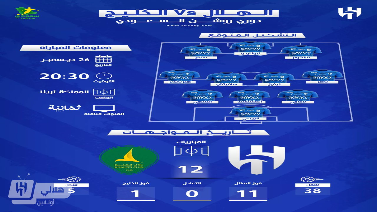 يترقب عشّاق الكرة السعودية مواجهة قوية تجمع الهلال بنظيره الخليج، ضمن منافسات الجولة الحادية عشرة من دوري روشن السعودي للمحترفين، في لقاء يسعى من خلاله «الزعيم» لمواصلة الضغط على الصدارة، بينما يطمح الخليج للخروج بنتيجة إيجابية تعزز موقعه في جدول الترتيب.