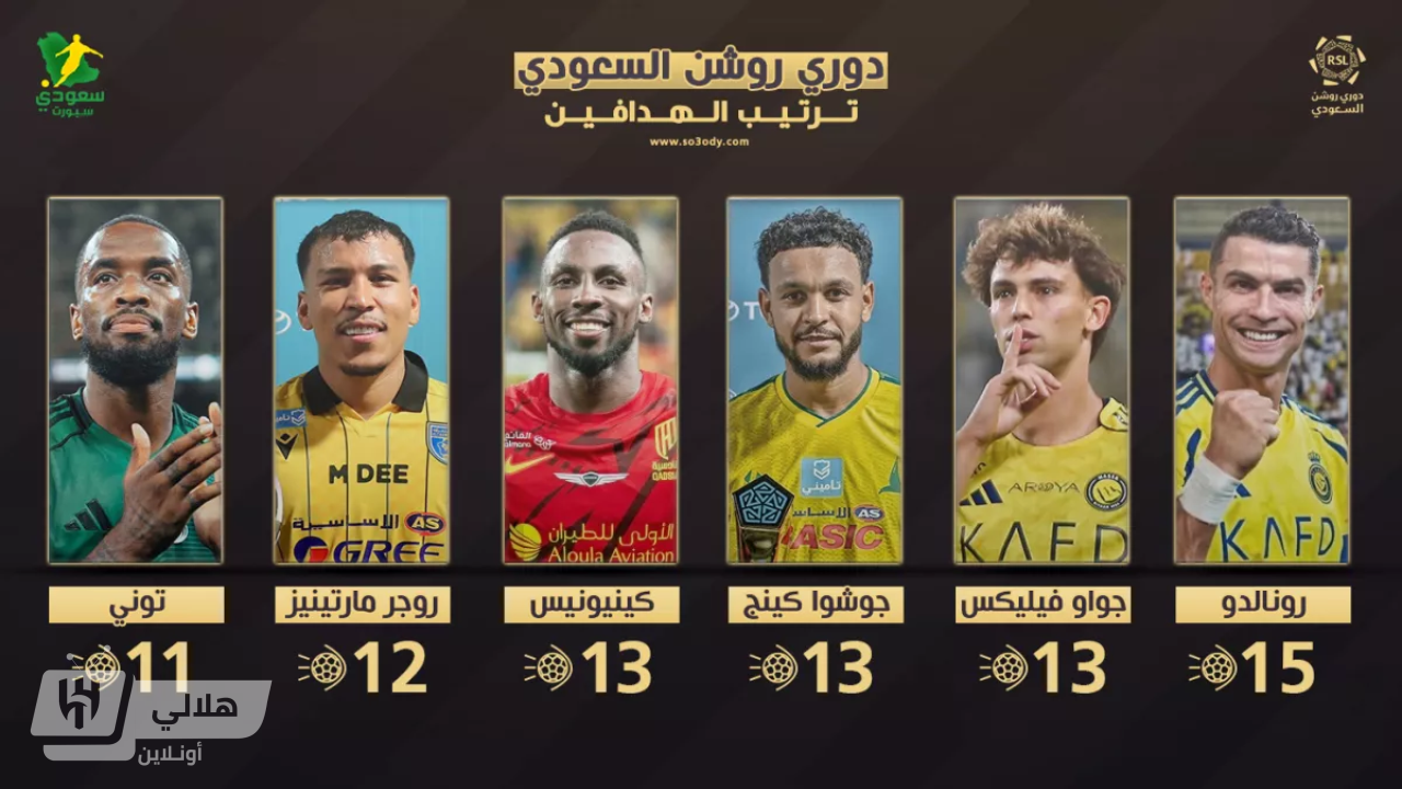 ويواصل البرتغالي كريستيانو رونالدو، الحفاظ على صدارة ترتيب هدافي دوري روشن برصيد 15 هدفًا.
